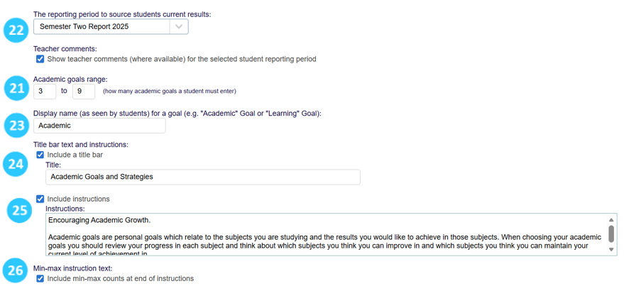 The user will then setup the headings, titles and instructions for the Academic Goals.The user can enter a display name for this section (e.g. Academic). This can be useful if the Pathway has an Academic and Pastoral section.